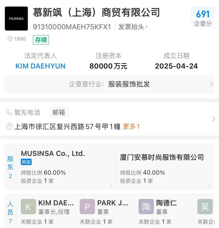而在这背后,中国运动品牌巨头安踏体育的身影清晰可见——2025年初,安踏以500亿韩元收购Musinsa约1.7%的股份;随后,双方合资成立“MusinsaChina”,安踏持股40%(厦门安慕时尚服饰有限公司成立于2025年2月28日,由安踏投资有限公司100%持股)。